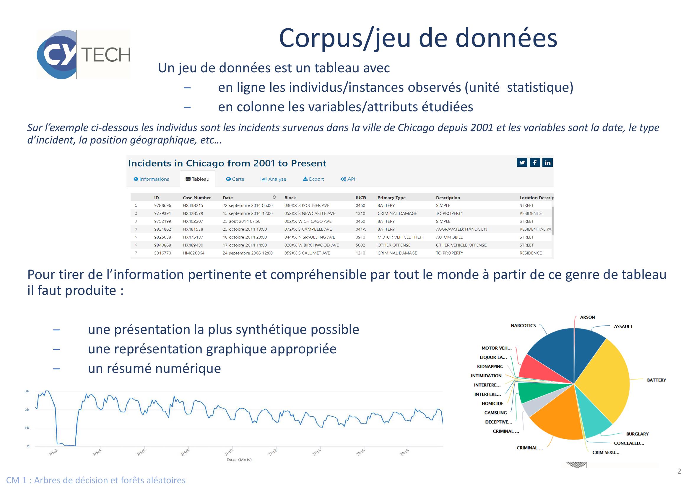Page 2 : CM 1 : Arbres de décision et forêts aléatoiresCorpus/jeu de donnéesSur l’exemple ci-dessous les individus sont les incidents survenus dans la ville de Chicago depuis 2001 et les variables sont la date, le type d’incident, la position géographique, etc…Pour tirer de l’information pertinente et compréhensible par tout le monde à partir de ce genre de tableau il faut produite :–une présentation la plus synthétique possible–une représentation graphique appropriée–un résumé numériqueUn jeu de données est un tableau avec–en ligne les individus/instances observés unité statistique–en colonne les variables/attributs étudiées2