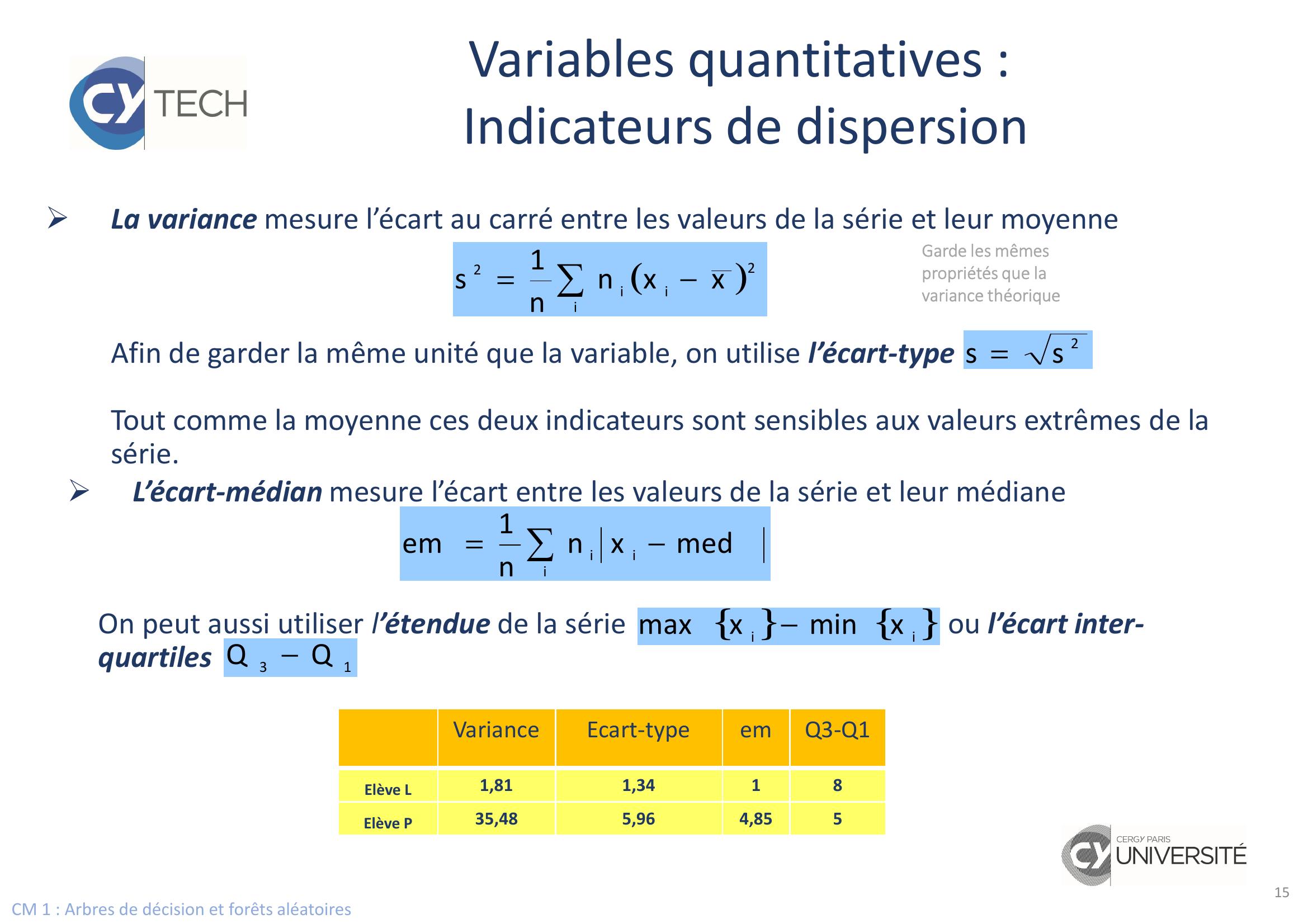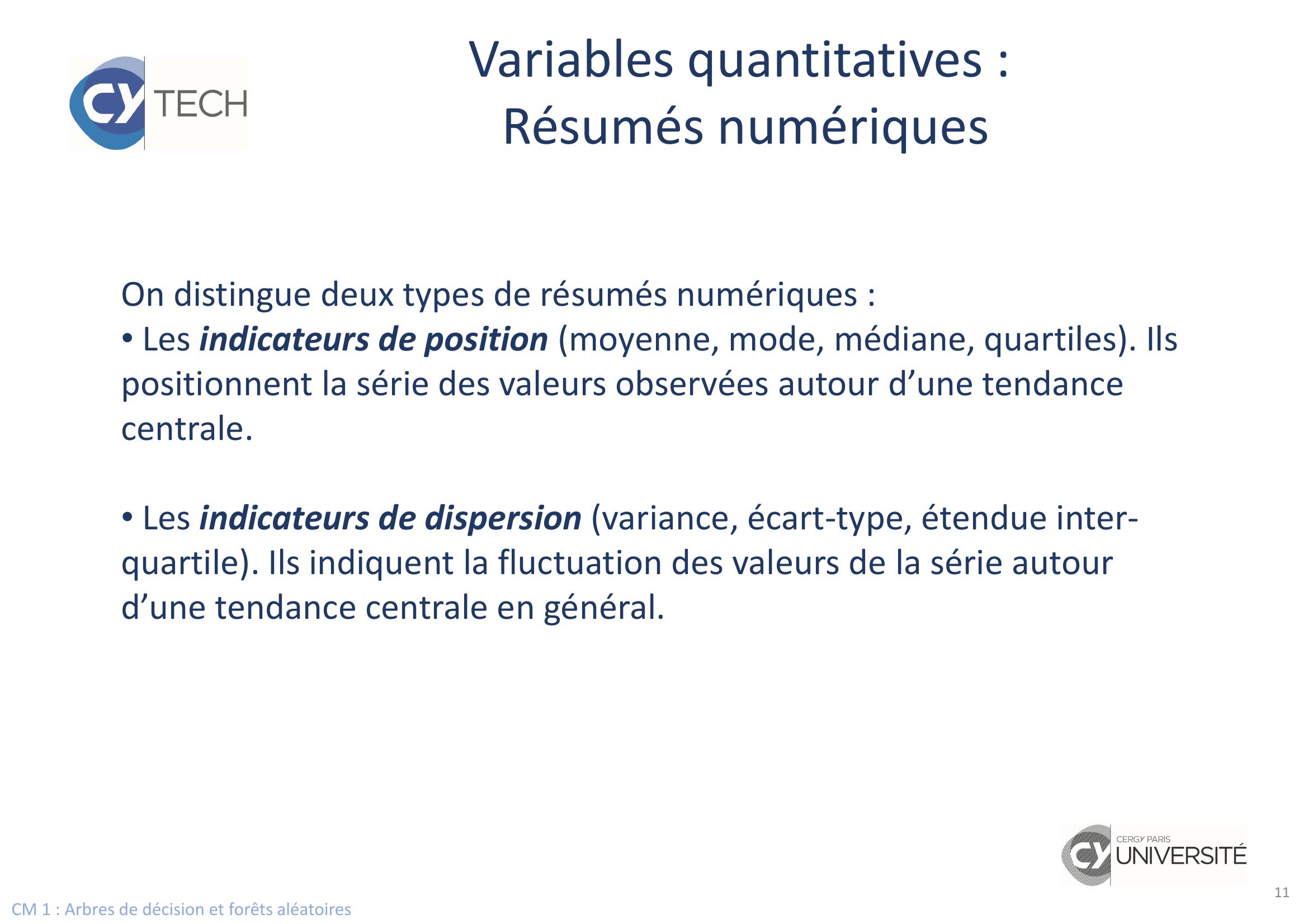 Page 11 : CM 1 : Arbres de décision et forêts aléatoires11Variables quantitatives : Résumés numériquesOn distingue deux types de résumés numériques : • Les indicateurs de position moyenne, mode, médiane, quartiles. Ils positionnent la série des valeurs observées autour d’une tendance centrale.• Les indicateurs de dispersion variance, écart-type, étendue inter-quartile. Ils indiquent la fluctuation des valeurs de la série autour d’une tendance centrale en général.