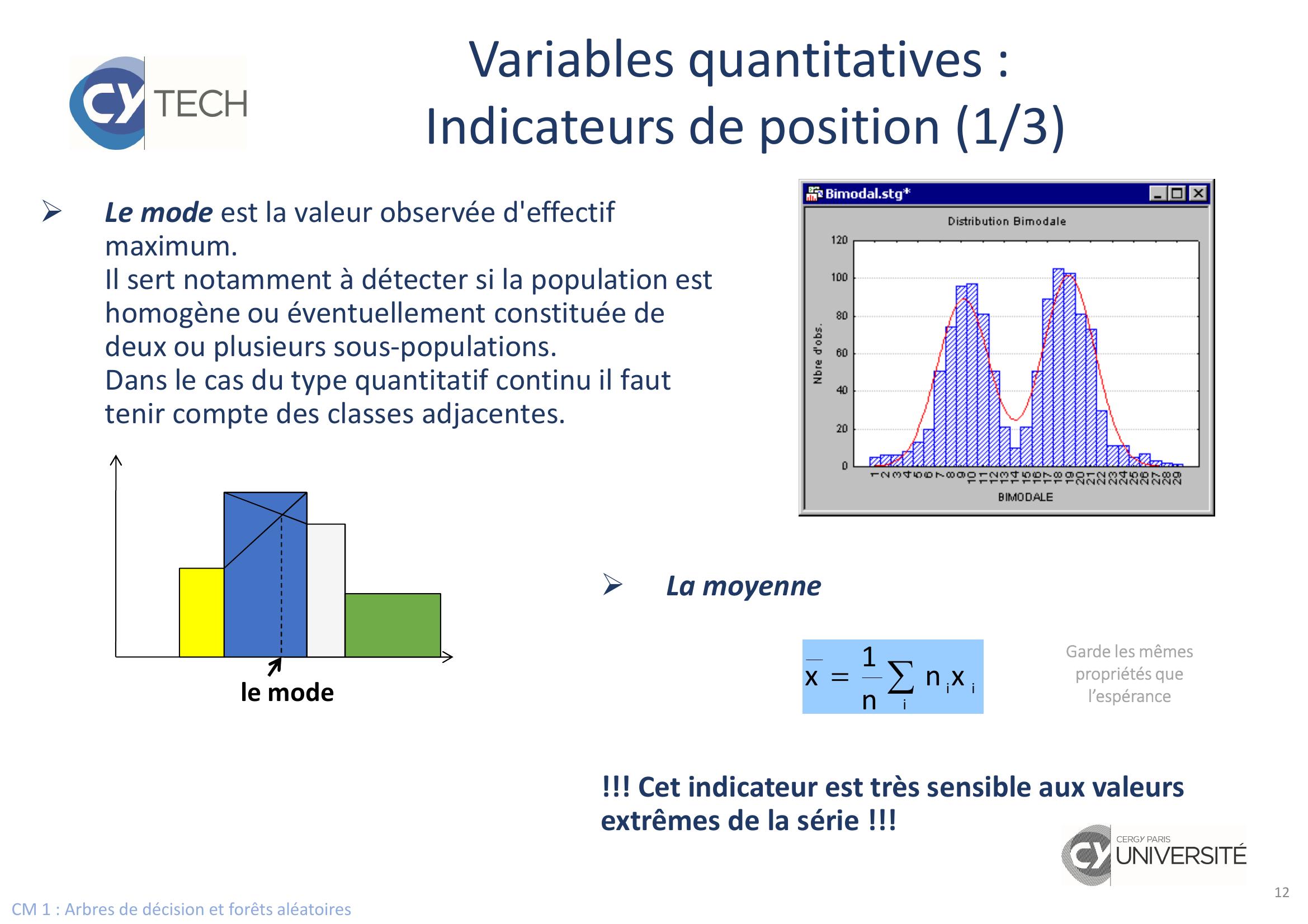 Page 12 : CM 1 : Arbres de décision et forêts aléatoires12Variables quantitatives : Indicateurs de position 1/3Le mode est la valeur observée d'effectif maximum. Il sert notamment à détecter si la population est homogène ou éventuellement constituée de deux ou plusieurs sous-populations.Dans le cas du type quantitatif continu il faut tenir compte des classes adjacentes. le modeLa moyenne!!! Cet indicateur est très sensible aux valeursextrêmes de la série !!!=iiixnn1xGarde les mêmes propriétés que l’espérance