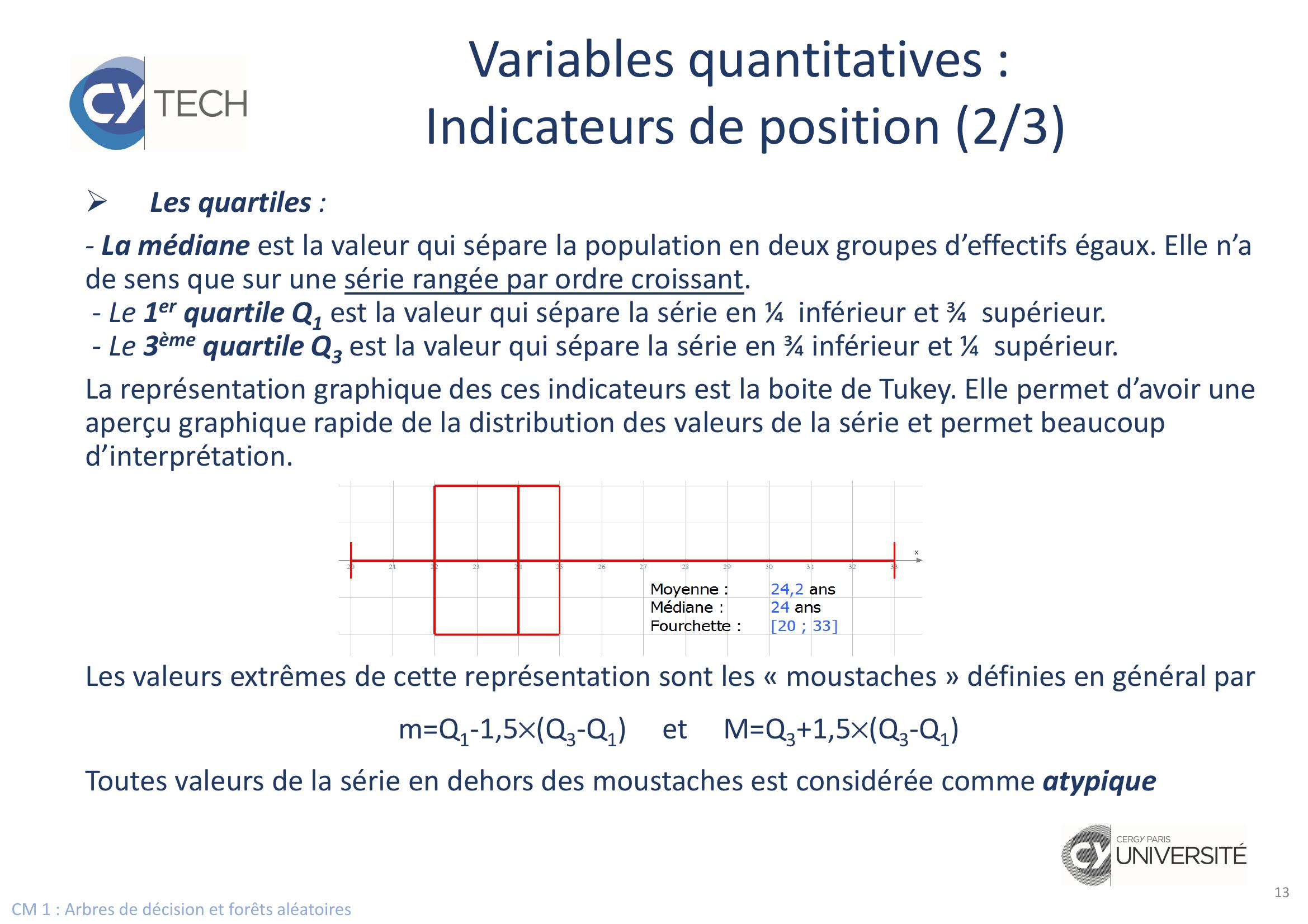 Page 13 : CM 1 : Arbres de décision et forêts aléatoires13Variables quantitatives : Indicateurs de position 2/3Les quartiles :- La médiane est la valeur qui sépare la population en deux groupes d’effectifs égaux. Elle n’a de sens que sur une série rangée par ordre croissant. - Le 1er quartile Q1 est la valeur qui sépare la série en ¼ inférieur et ¾ supérieur.- Le 3ème quartile Q3 est la valeur qui sépare la série en ¾ inférieur et ¼ supérieur.La représentation graphique des ces indicateurs est la boite de Tukey. Elle permet d’avoir une aperçu graphique rapide de la distribution des valeurs de la série et permet beaucoup d’interprétation. Les valeurs extrêmes de cette représentation sont les « moustaches » définies en général parm=Q1-1,5×Q3-Q1 et M=Q3+1,5×Q3-Q1 Toutes valeurs de la série en dehors des moustaches est considérée comme atypique