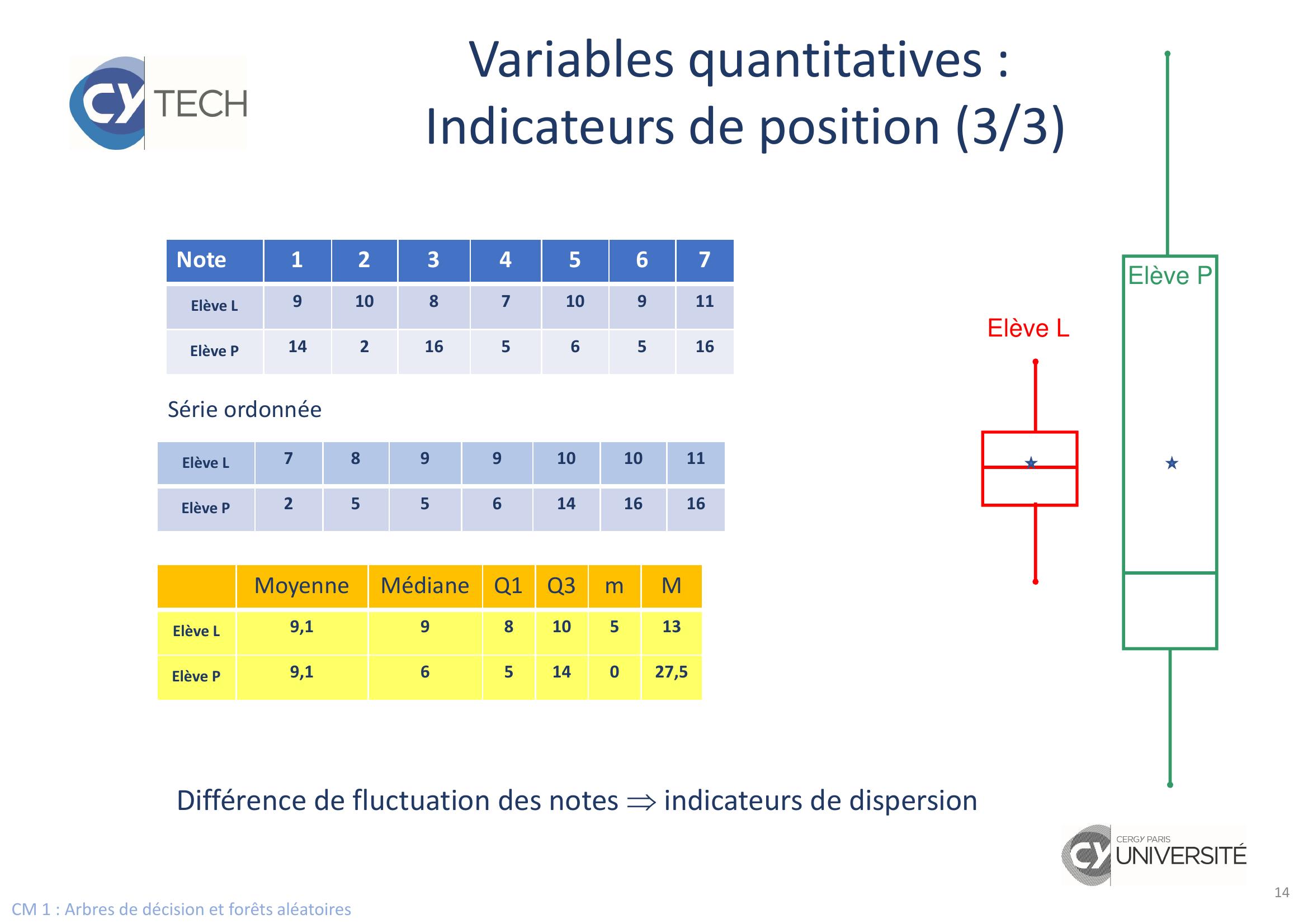 Page 14 : CM 1 : Arbres de décision et forêts aléatoires14Variables quantitatives : Indicateurs de position 3/3Note1234567Elève L9108710911Elève P1421656516Elève L7899101011Elève P2556141616Série ordonnéeMoyenneMédianeQ1Q3mMElève L9,19810513Elève P9,16514027,5Différence de fluctuation des notes indicateurs de dispersionElève PElève L