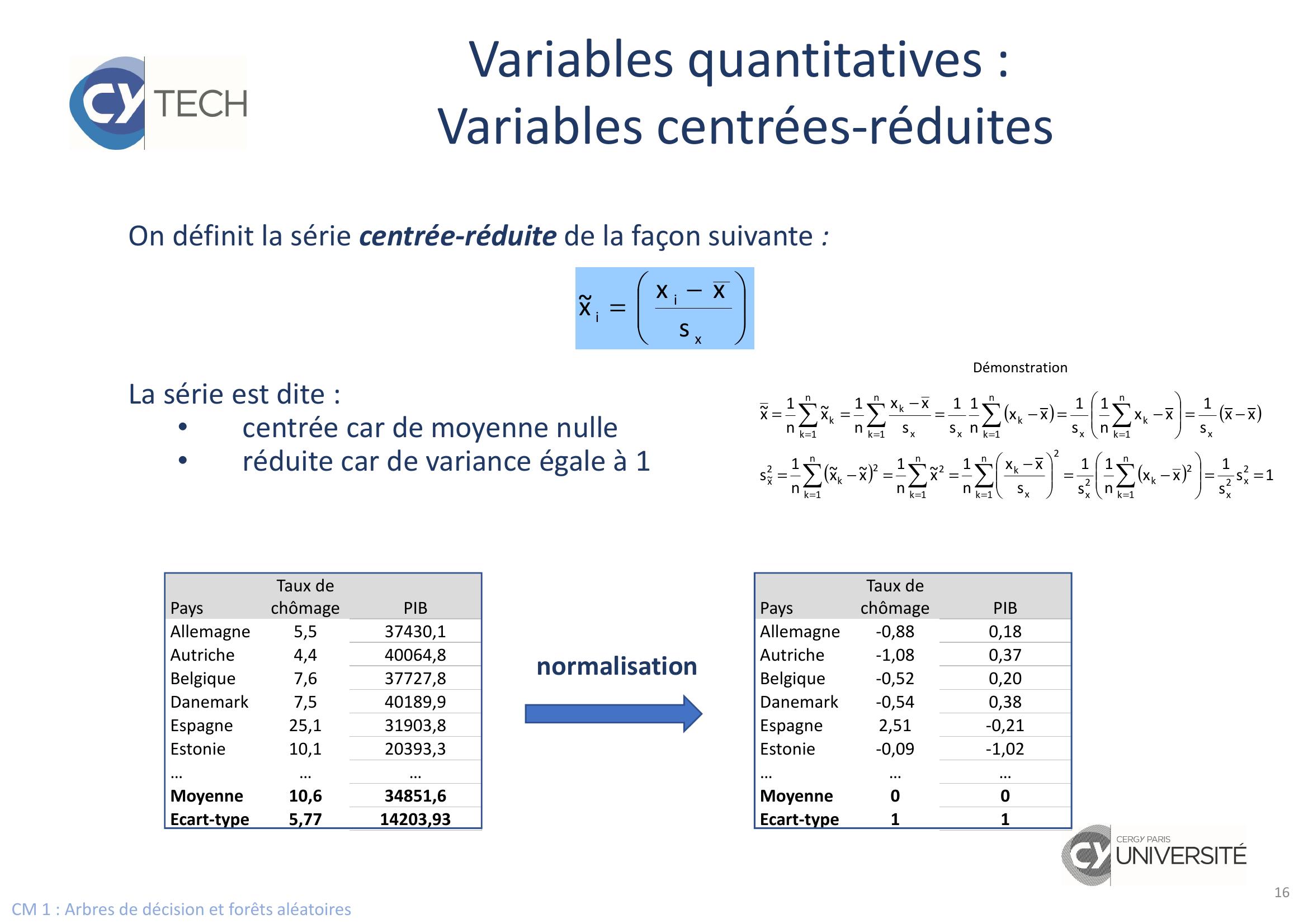 Page 16 : CM 1 : Arbres de décision et forêts aléatoires16Variables quantitatives : Variables centrées-réduitesOn définit la série centrée-réduite de la façon suivante :=xiisxxxLa série est dite :•centrée car de moyenne nulle•réduite car de variance égale à 1PaysTaux de chômagePIBAllemagne5,537430,1Autriche4,440064,8Belgique7,637727,8Danemark7,540189,9Espagne25,131903,8Estonie10,120393,3………Moyenne10,634851,6Ecart-type5,7714203,93PaysTaux de chômagePIBAllemagne-0,880,18Autriche-1,080,37Belgique-0,520,20Danemark-0,540,38Espagne2,51-0,21Estonie-0,09-1,02………Moyenne00Ecart-type11normalisationxxs1xxn1s1xxn1s1sxxn1xn1xxn1kkxn1kkxn1kxkn1kk=========1ss1xxn1s1sxxn1xn1xxn1s2x2xn1k2k2x2n1kxkn1k2n1k2k2x==========Démonstration