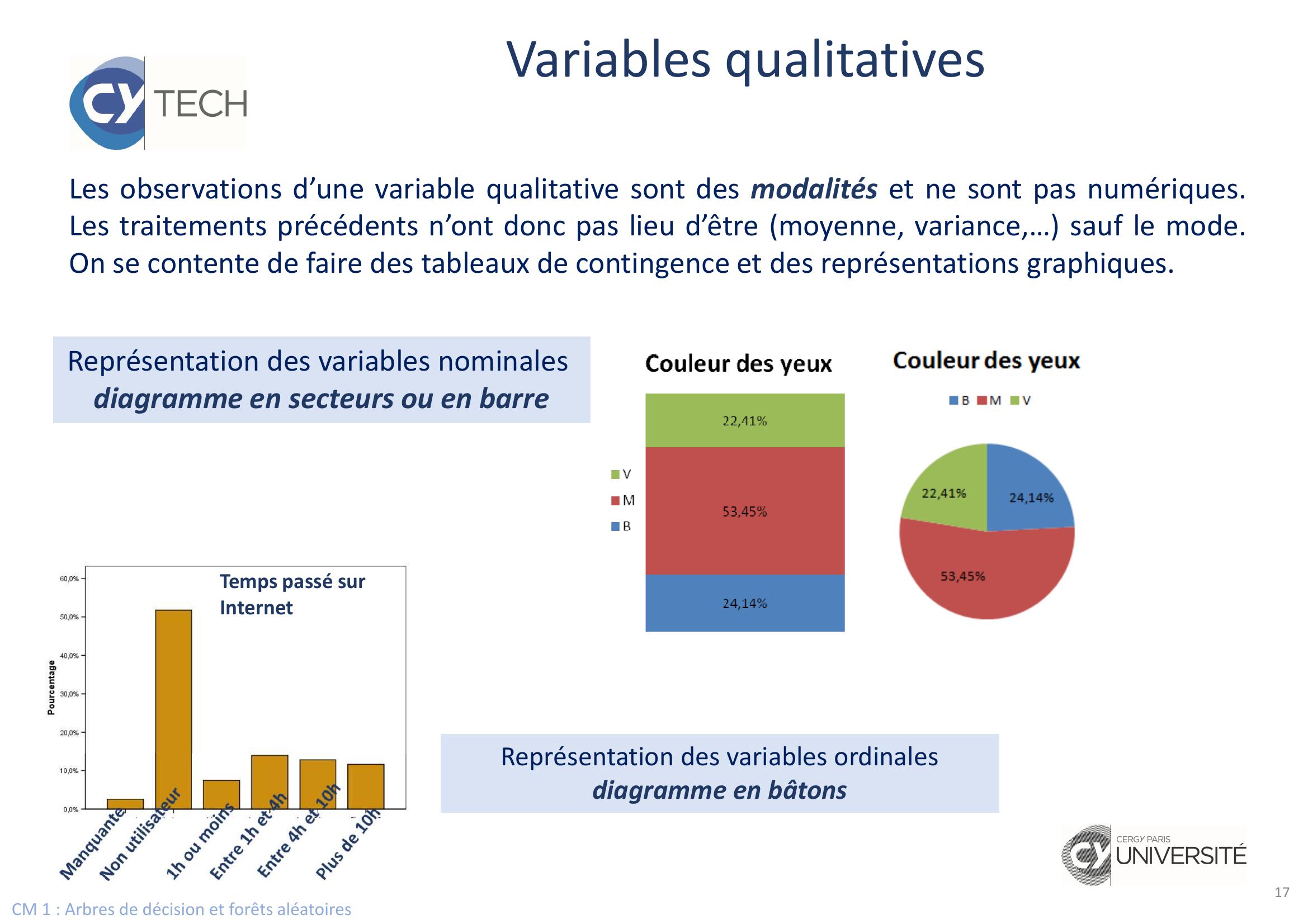 Page 17 : CM 1 : Arbres de décision et forêts aléatoires17Variables qualitativesLes observations d’une variable qualitative sont des modalités et ne sont pas numériques.Les traitements précédents n’ont donc pas lieu d’être moyenne, variance,… sauf le mode.On se contente de faire des tableaux de contingence et des représentations graphiques.Temps passé sur InternetReprésentation des variables nominalesdiagramme en secteurs ou en barre Représentation des variables ordinales diagramme en bâtons