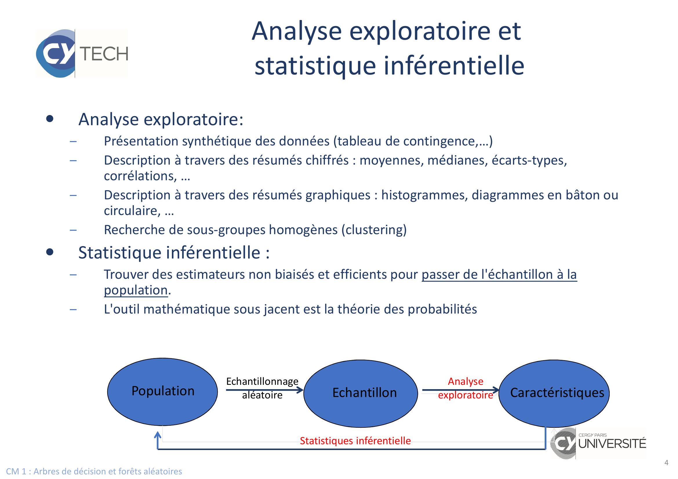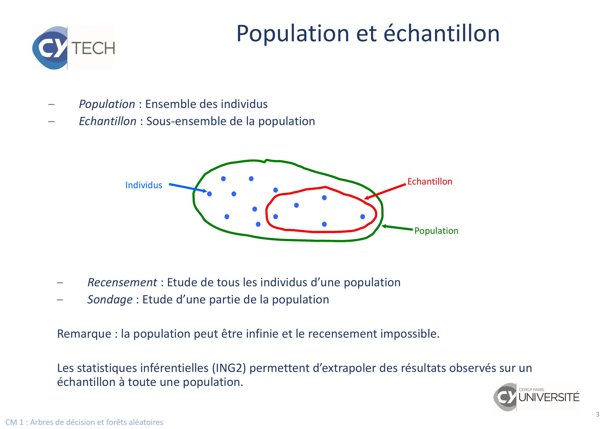 Page 3 : CM 1 : Arbres de décision et forêts aléatoiresPopulation et échantillon–Population : Ensemble des individus–Echantillon : Sous-ensemble de la populationIndividusEchantillonPopulation–Recensement : Etude de tous les individus d’une population –Sondage : Etude d’une partie de la populationRemarque : la population peut être infinie et le recensement impossible.Les statistiques inférentielles ING2 permettent d’extrapoler des résultats observés sur un échantillon à toute une population.3