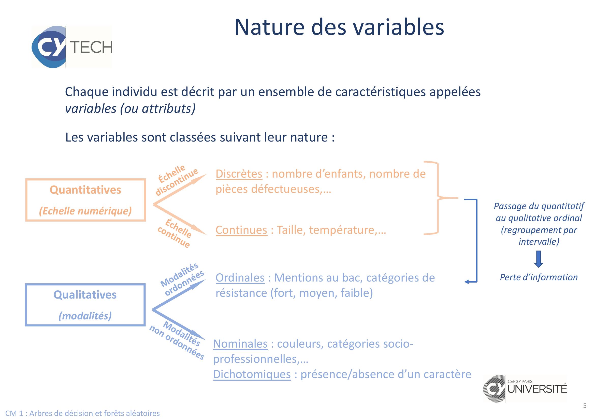 Page 5 : CM 1 : Arbres de décision et forêts aléatoires5Chaque individu est décrit par un ensemble de caractéristiques appelées variables ou attributsLes variables sont classées suivant leur nature :QuantitativesEchelle numériqueQualitativesmodalitésDiscrètes : nombre d’enfants, nombre de pièces défectueuses,…Continues : Taille, température,…Nominales : couleurs, catégories socio-professionnelles,…Dichotomiques : présence/absence d’un caractèreOrdinales : Mentions au bac, catégories de résistance fort, moyen, faibleNature des variablesPassage du quantitatif au qualitative ordinal regroupement par intervallePerte d’information