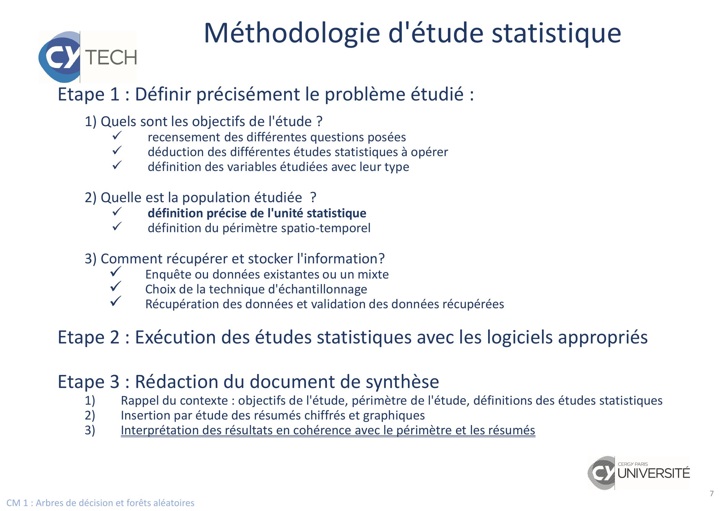 Page 7 : CM 1 : Arbres de décision et forêts aléatoires7Etape 1 : Définir précisément le problème étudié :1 Quels sont les objectifs de l'étude ?recensement des différentes questions poséesdéduction des différentes études statistiques à opérerdéfinition des variables étudiées avec leur type2 Quelle est la population étudiée ?définition précise de l'unité statistiquedéfinition du périmètre spatio-temporel 3 Comment récupérer et stocker l'information?Enquête ou données existantes ou un mixteChoix de la technique d'échantillonnageRécupération des données et validation des données récupéréesEtape 2 : Exécution des études statistiques avec les logiciels appropriésEtape 3 : Rédaction du document de synthèse1Rappel du contexte : objectifs de l'étude, périmètre de l'étude, définitions des études statistiques2Insertion par étude des résumés chiffrés et graphiques3Interprétation des résultats en cohérence avec le périmètre et les résumés Méthodologie d'étude statistique