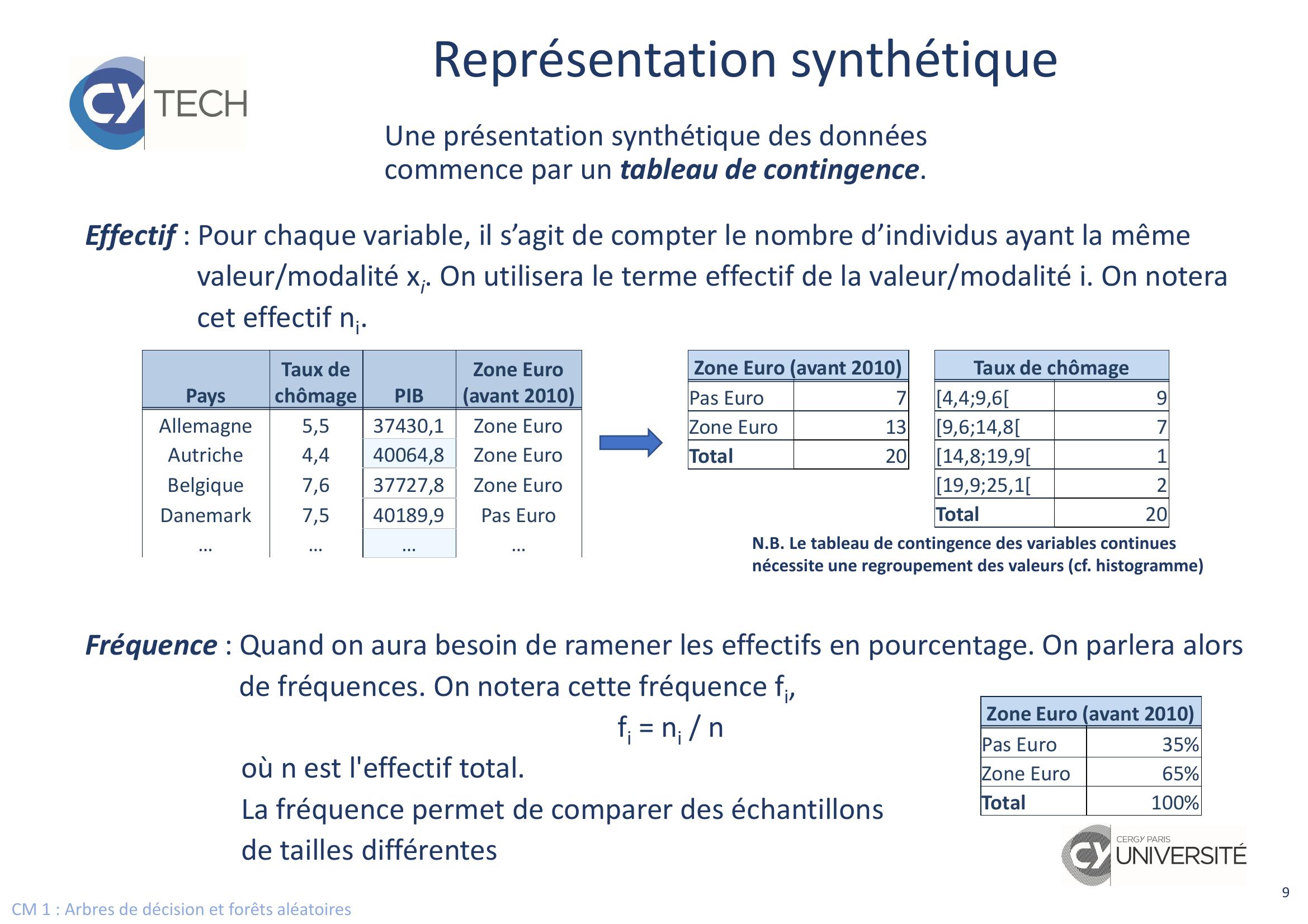 Page 9 : CM 1 : Arbres de décision et forêts aléatoires9Effectif : Pour chaque variable, il s’agit de compter le nombre d’individus ayant la même valeur/modalité xi. On utilisera le terme effectif de la valeur/modalité i. On notera cet effectif ni.Fréquence : Quand on aura besoin de ramener les effectifs en pourcentage. On parlera alors de fréquences. On notera cette fréquence fi,fi = ni / n où n est l'effectif total.La fréquence permet de comparer des échantillons de tailles différentesTaux de chômage4,4;9,699,6;14,8714,8;19,9119,9;25,12Total20Une présentation synthétique des données commence par un tableau de contingence. Zone Euro avant 2010Pas Euro35Zone Euro65Total100Zone Euro avant 2010Pas Euro7Zone Euro13Total20PaysTaux de chômagePIBZone Euro avant 2010Allemagne5,537430,1Zone EuroAutriche4,440064,8Zone EuroBelgique7,637727,8Zone EuroDanemark7,540189,9Pas Euro…………N.B. Le tableau de contingence des variables continues nécessite une regroupement des valeurs cf. histogrammeReprésentation synthétique