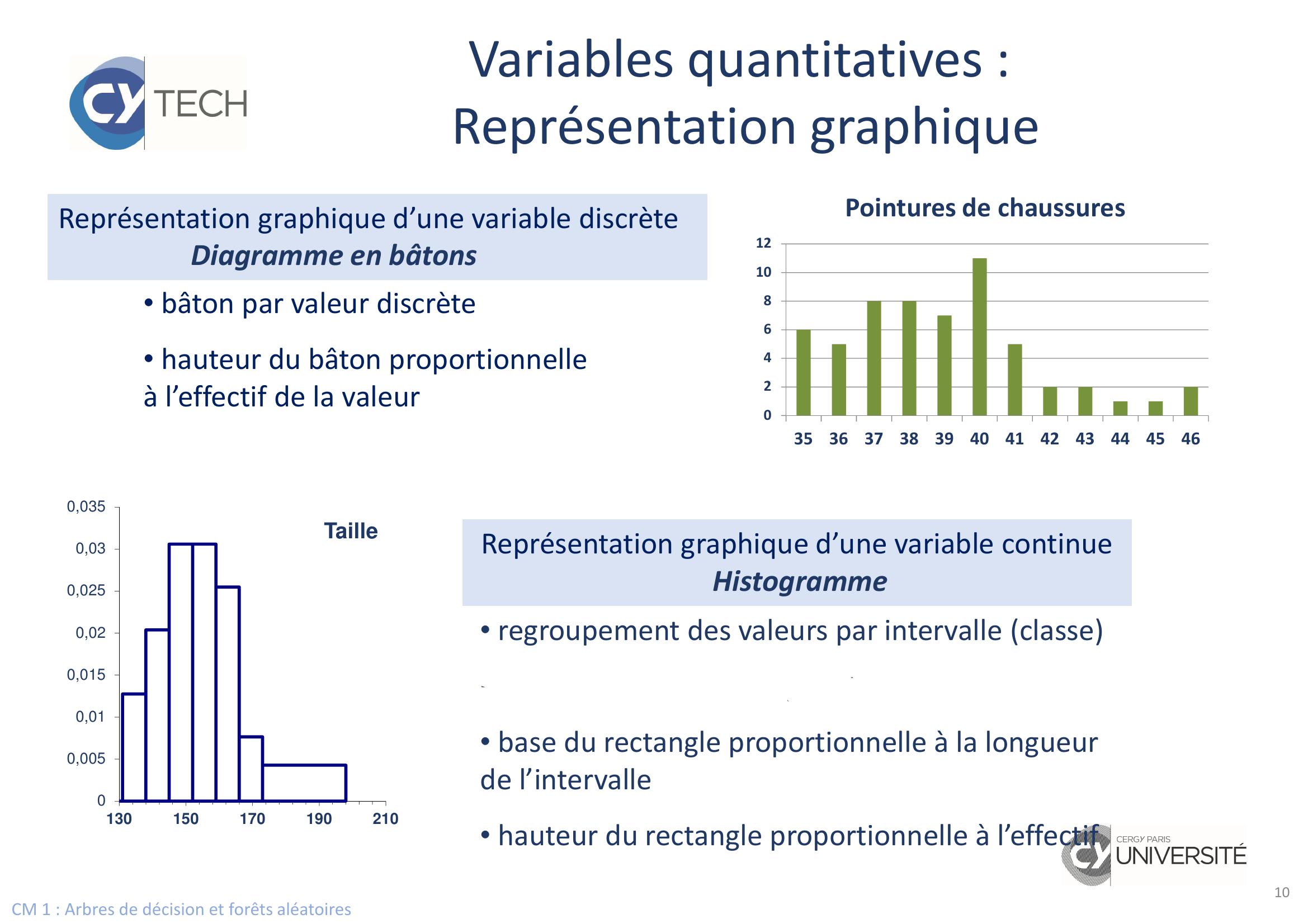 Page 10 : CM 1 : Arbres de décision et forêts aléatoires10Variables quantitatives : Représentation graphiqueReprésentation graphique d’une variable discrète Diagramme en bâtonsReprésentation graphique d’une variable continueHistogramme• bâton par valeur discrète• hauteur du bâton proportionnelle à l’effectif de la valeur024681012353637383940414243444546Pointures de chaussures00,0050,010,0150,020,0250,030,035130150170190210Taille• regroupement des valeurs par intervalle classe• nombre de classes E1+10×log10n/3• base du rectangle proportionnelle à la longueur de l’intervalle• hauteur du rectangle proportionnelle à l’effectif