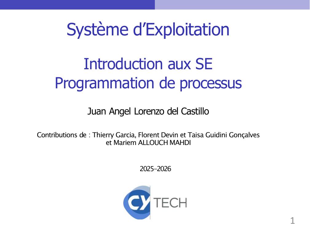 Page 1 : Système d’ExploitationIntroduction aux SE Programmation de processusJuan Angel Lorenzo del CastilloContributions de : Thierry Garcia, Florent Devin et Taisa Guidini Gonçalves et Mariem ALLOUCH MAHDI2025-20261
