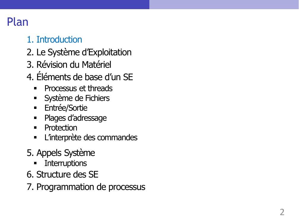 Page 2 : Plan1. Introduction2. Le Système d’Exploitation3. Révision du Matériel4. Éléments de base d’un SEProcessus et threads Système de Fichiers Entrée/Sortie Plages d’adressage ProtectionL’interprète des commandes5. Appels SystèmeInterruptions6. Structure des SE7. Programmation de processus2
