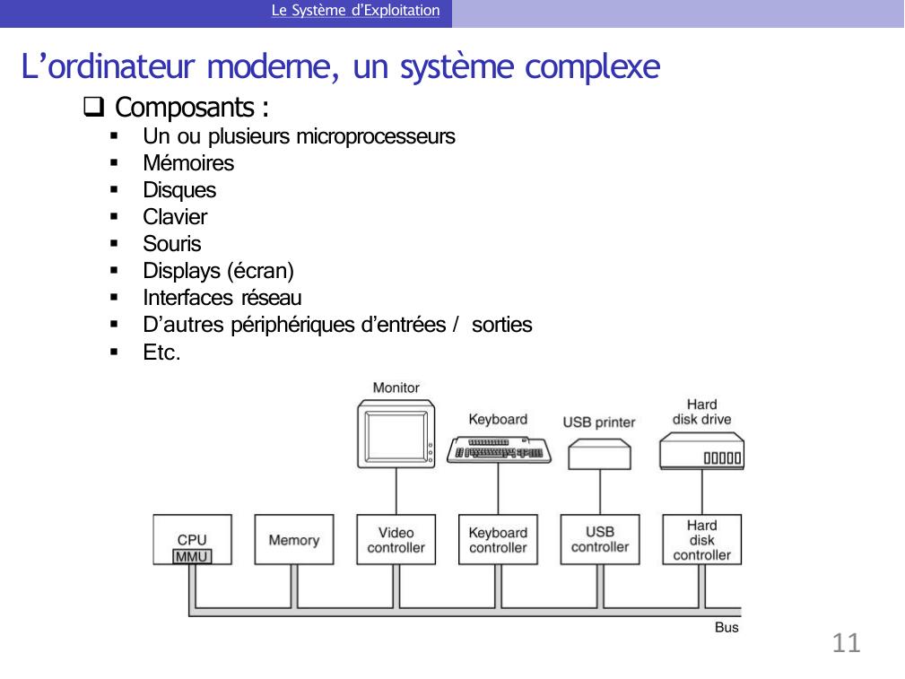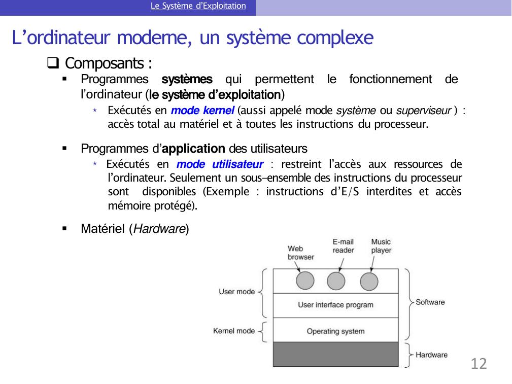 Page 11 : Le Système d’ExploitationL’ordinateur moderne, un système complexeComposants :Un ou plusieurs microprocesseursMémoiresDisquesClavierSourisDisplays écranInterfaces réseauD’autres périphériques d’entrées / sortiesEtc.11