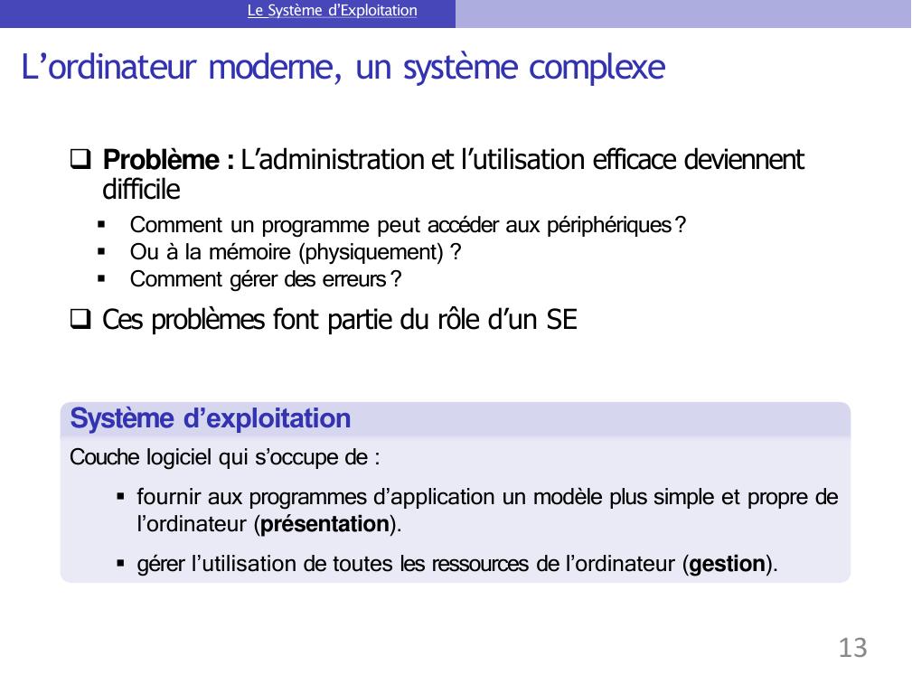 Page 13 : Le Système d’ExploitationL’ordinateur moderne, un système complexeProblème : L’administration et l’utilisation efficace deviennent difficileComment un programme peut accéder aux périphériques?Ou à la mémoire physiquement ?Comment gérer des erreurs?Ces problèmes font partie du rôle d’un SESystème d’exploitationCouche logiciel qui s’occupe de :fournir aux programmes d’application un modèle plus simple et propre de l’ordinateur présentation.gérer l’utilisation de toutes les ressources de l’ordinateur gestion.13