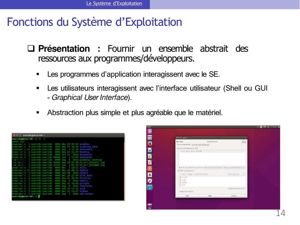 Page 14 : Le Système d’ExploitationFonctions du Système d’ExploitationPrésentation : Fournirun ensemble abstraitdesressources aux programmes/développeurs.Les programmes d’application interagissent avec le SE.Les utilisateurs interagissent avec l’interface utilisateur Shell ou GUI- Graphical User Interface.Abstraction plus simple et plus agréable que le matériel.14