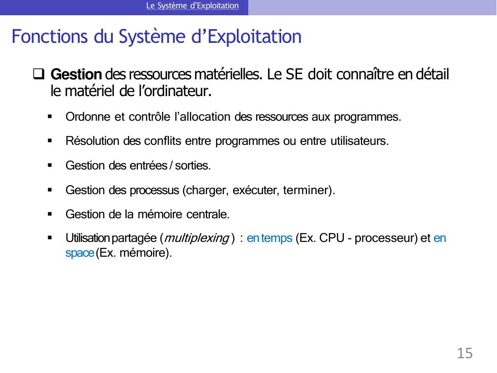 Page 15 : Le Système d’ExploitationFonctions du Système d’ExploitationGestion des ressources matérielles. Le SE doit connaître en détail le matériel de l’ordinateur.Ordonne et contrôle l’allocation des ressources aux programmes.Résolution des conflits entre programmes ou entre utilisateurs.Gestion des entrées/ sorties.Gestion des processus charger, exécuter, terminer.Gestion de la mémoire centrale.Utilisationpartagée multiplexing : entemps Ex. CPU - processeur et enspaceEx. mémoire.15