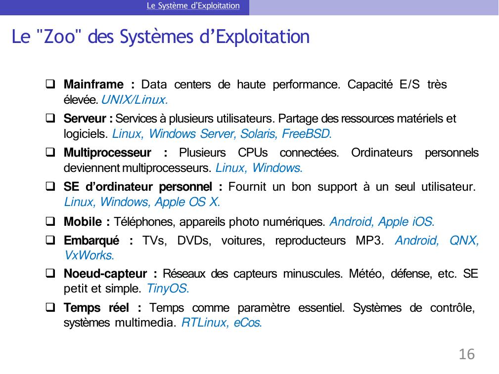 Page 16 : Le Système d’ExploitationLe "Zoo" des Systèmes d’ExploitationMainframe : Data centers de haute performance. Capacité E/S trèsélevée.UNIX/Linux.Serveur : Services à plusieurs utilisateurs. Partage des ressources matériels etlogiciels. Linux, Windows Server, Solaris, FreeBSD.Multiprocesseur:PlusieursCPUsconnectées.Ordinateurspersonnelsdeviennent multiprocesseurs. Linux, Windows.SE d’ordinateur personnel : Fournit un bon support à un seul utilisateur.Linux, Windows, Apple OS X.Mobile : Téléphones, appareils photo numériques. Android, Apple iOS.Embarqué : TVs, DVDs, voitures, reproducteurs MP3.Android, QNX,VxWorks.Noeud-capteur : Réseaux des capteurs minuscules. Météo, défense, etc. SEpetit et simple. TinyOS.Temps réel : Temps comme paramètre essentiel. Systèmes de contrôle,systèmes multimedia. RTLinux, eCos.16