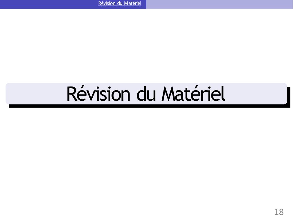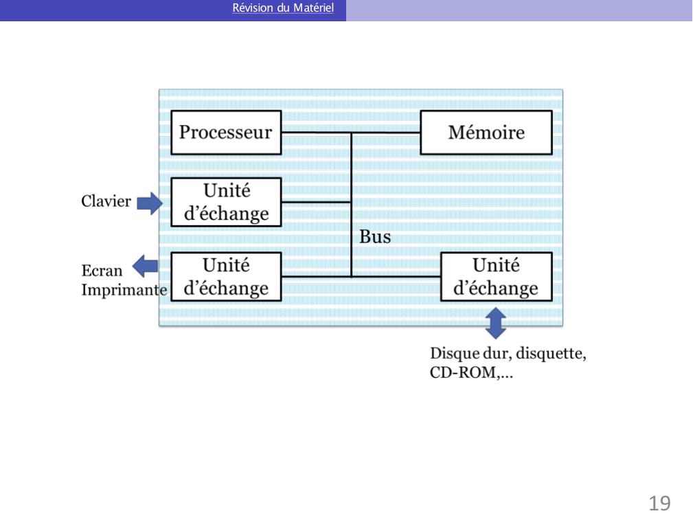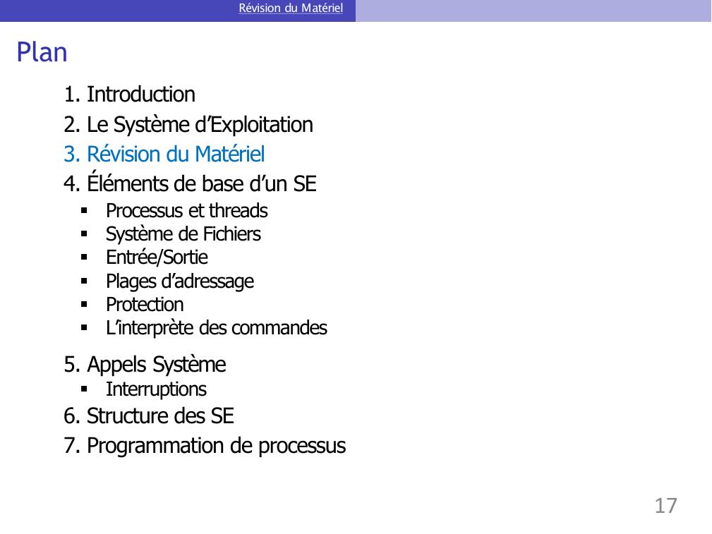 Page 17 : Plan1. Introduction2. Le Système d’Exploitation3. Révision du Matériel4. Éléments de base d’un SEProcessus et threads Système de Fichiers Entrée/Sortie Plages d’adressage ProtectionL’interprète des commandes5. Appels SystèmeInterruptions6. Structure des SE7. Programmation de processusRévision du Matériel17