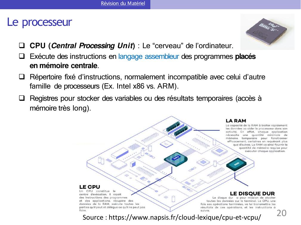 Page 20 : Révision du MatérielLe processeurCPU Central Processing Unit : Le “cerveau” de l’ordinateur.Exécute des instructions en langage assembleur des programmes placésen mémoire centrale.Répertoire fixé d’instructions, normalement incompatible avec celui d’autrefamille de processeurs Ex. Intel x86 vs. ARM.Registres pour stocker des variables ou des résultats temporaires accès àmémoire très long.20Source : https://www.napsis.fr/cloud-lexique/cpu-et-vcpu/