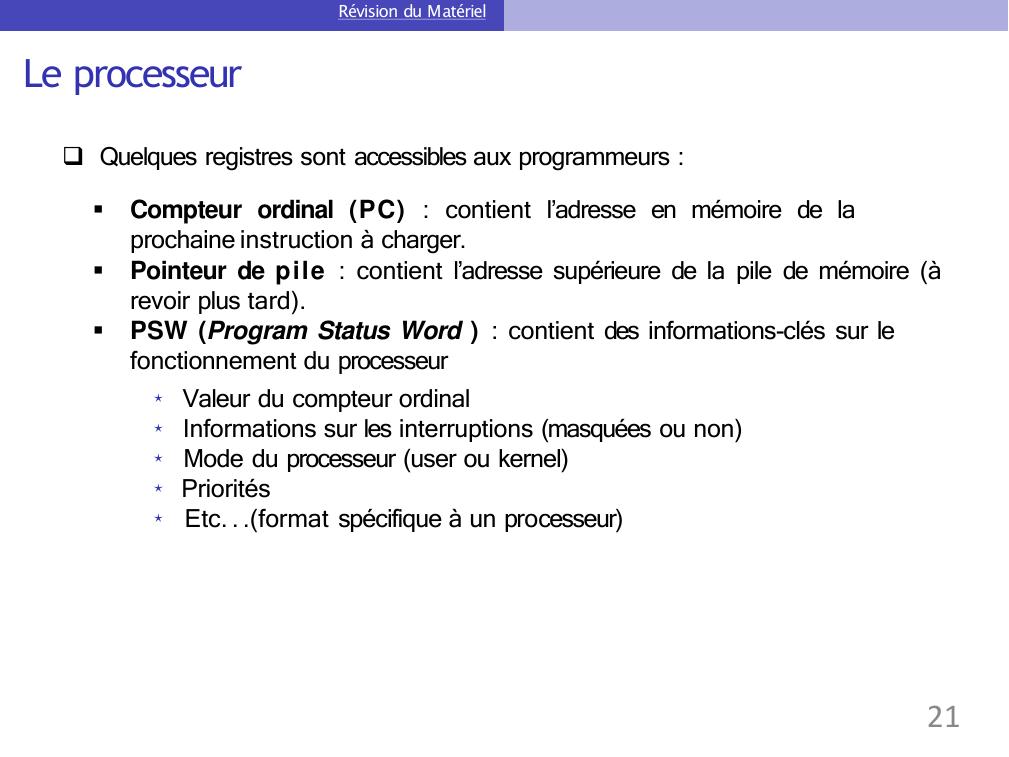 Page 21 : Révision du MatérielLe processeurQuelques registres sont accessibles aux programmeurs :Compteur ordinal PC : contient l’adresse en mémoire de laprochaine instruction à charger.Pointeur de pile : contient l’adresse supérieure de la pile de mémoire àrevoir plus tard.PSW Program Status Word : contient des informations-clés sur lefonctionnement du processeurValeur du compteur ordinalInformations sur les interruptions masquées ou nonMode du processeur user ou kernelPrioritésEtc. . .format spécifique à un processeur21
