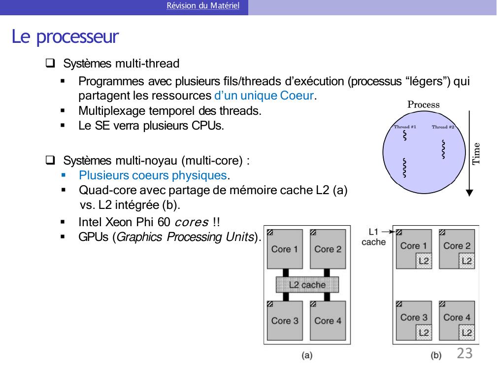 Page 23 : Révision du MatérielLe processeurSystèmes multi-threadProgrammes avec plusieurs fils/threads d’exécution processus “légers” qui partagent les ressources d’un unique Coeur.Multiplexage temporel des threads.Le SE verra plusieurs CPUs.Systèmes multi-noyau multi-core :Plusieurs coeurs physiques. Quad-core avec partage de mémoire cache L2 a vs. L2 intégrée b.Intel Xeon Phi 60 cores !!GPUs Graphics Processing Units.23
