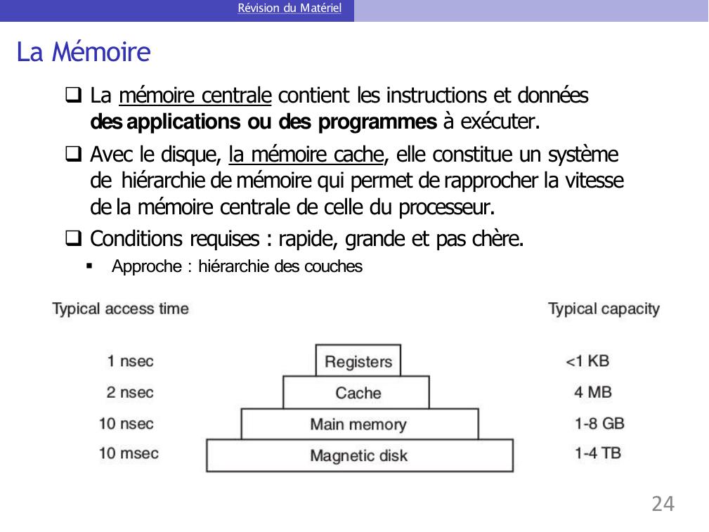 Page 24 : Révision du MatérielLa MémoireLa mémoire centrale contient les instructions et donnéesdes applications ou des programmes à exécuter.Avec le disque, la mémoire cache, elle constitue un systèmede hiérarchie de mémoire qui permet de rapprocher la vitesse de la mémoire centrale de celle du processeur.Conditions requises : rapide, grande et pas chère.Approche : hiérarchie des couches24