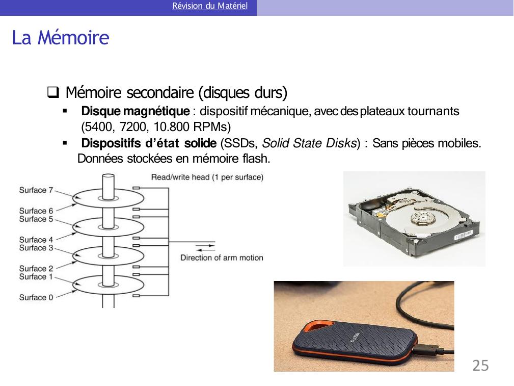 Page 25 : Révision du MatérielLa MémoireMémoire secondaire disques dursDisque magnétique : dispositif mécanique, avecdesplateaux tournants 5400, 7200, 10.800 RPMsDispositifs d’état solide SSDs, Solid State Disks : Sans pièces mobiles.Données stockées en mémoire flash.25