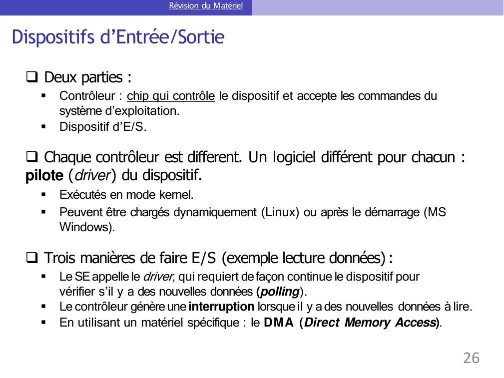 Page 26 : Révision du MatérielDispositifs d’Entrée/SortieDeux parties :Contrôleur : chip qui contrôle le dispositif et accepte les commandes du système d’exploitation.Dispositif d’E/S.Chaque contrôleur est different. Un logiciel différent pour chacun :pilote driver du dispositif.Exécutés en mode kernel.Peuvent être chargés dynamiquement Linux ou après le démarrage MS Windows.Trois manières de faire E/S exemple lecture données :Le SEappellele driver, qui requiert defaçon continue le dispositif pour vérifier s’il y a des nouvelles données polling.Le contrôleur génèreuneinterruption lorsqueil y ades nouvelles données à lire.En utilisant un matériel spécifique : le DMA Direct Memory Access.26