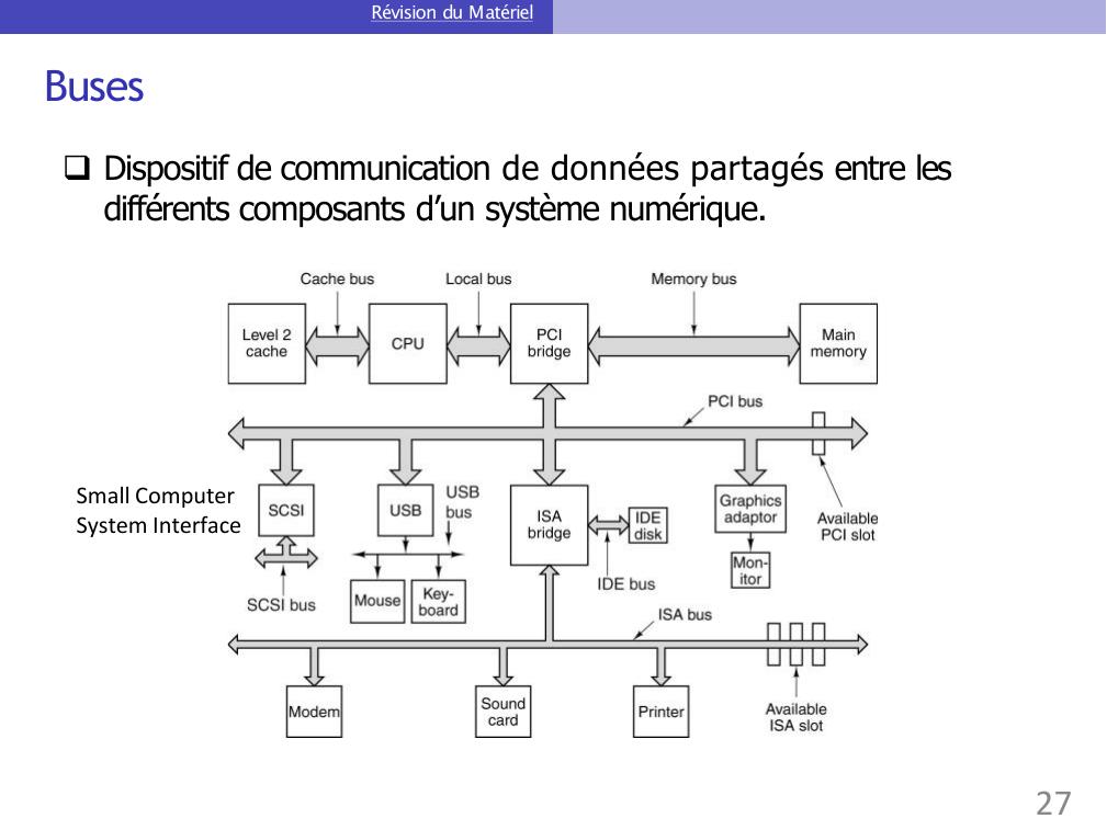 Page 27 : Révision du MatérielBusesDispositif de communication de données partagés entre lesdifférents composants d’un système numérique. 27Small Computer System Interface