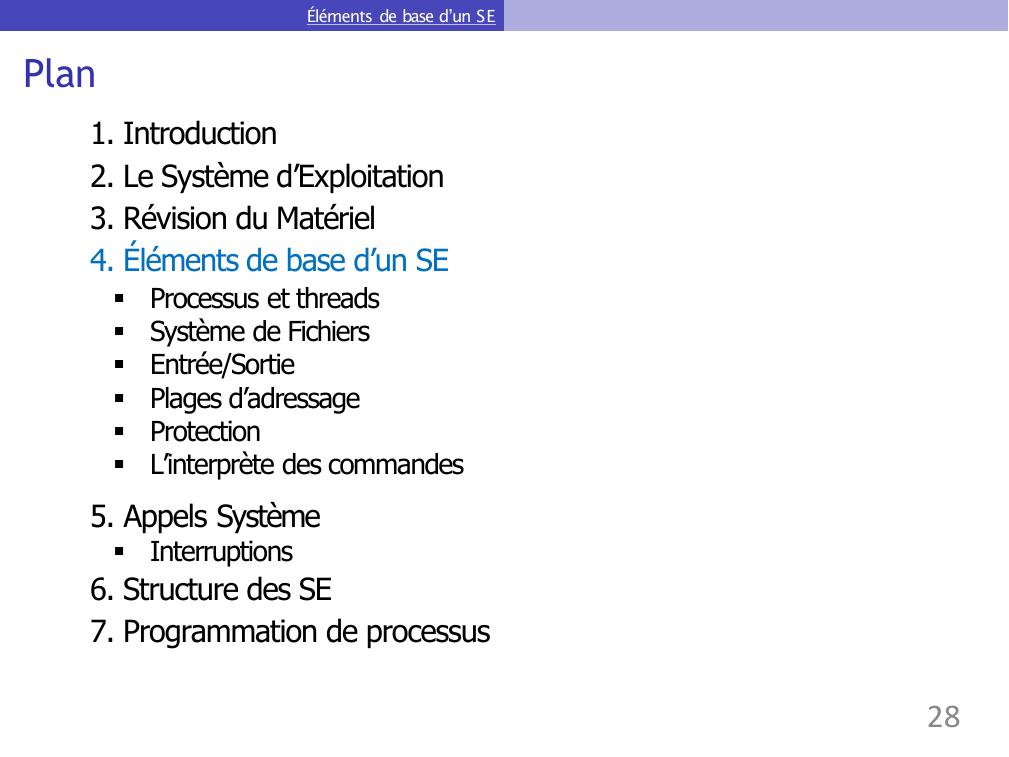 Page 28 : Plan1. Introduction2. Le Système d’Exploitation3. Révision du Matériel4. Éléments de base d’un SEProcessus et threads Système de Fichiers Entrée/Sortie Plages d’adressage ProtectionL’interprète des commandes5. Appels SystèmeInterruptions6. Structure des SE7. Programmation de processusÉléments de base d’un SE28