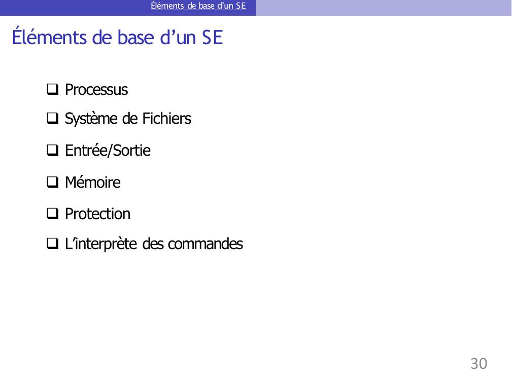 Page 30 : Éléments de base d’un SEÉléments de base d’un SEProcessusSystème de FichiersEntrée/SortieMémoireProtectionL’interprète des commandes30