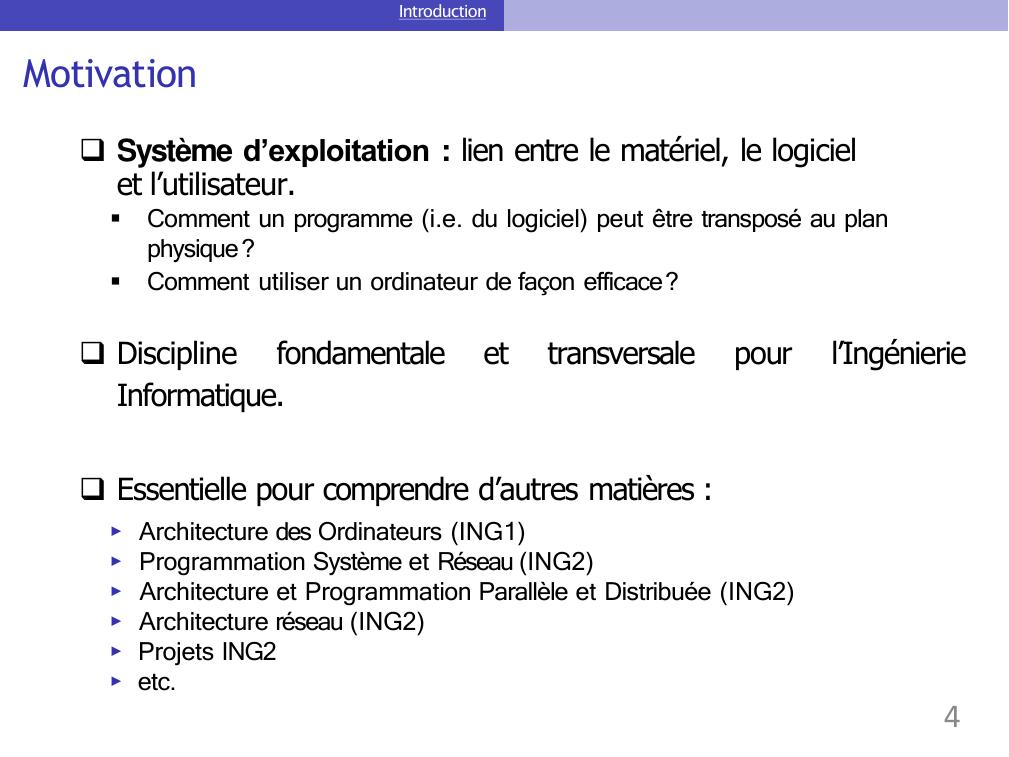 Page 4 : IntroductionMotivationSystème d’exploitation : lien entre le matériel, le logicielet l’utilisateur.Comment un programme i.e. du logiciel peut être transposé au planphysique?Comment utiliser un ordinateur de façon efficace?Disciplinefondamentaleettransversalepourl’IngénierieInformatique.Essentielle pour comprendre d’autres matières :▶Architecture des Ordinateurs ING1▶Programmation Système et Réseau ING2▶Architecture et Programmation Parallèle et Distribuée ING2▶Architecture réseau ING2▶Projets ING2▶etc.4