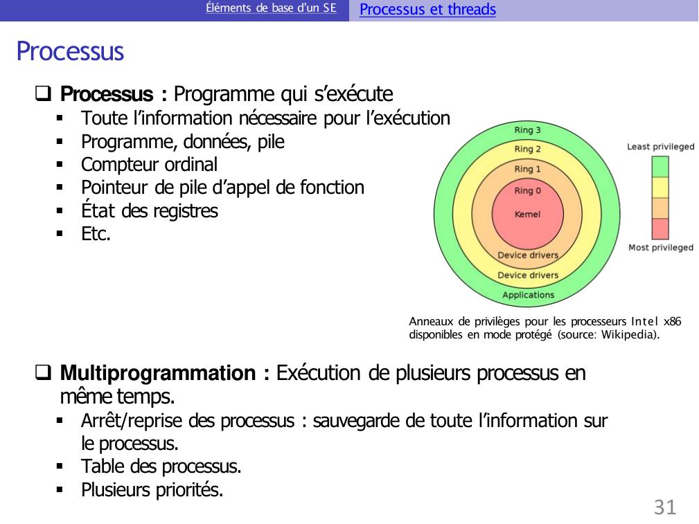 Page 31 : Processus : Programme qui s’exécuteToute l’information nécessaire pour l’exécutionProgramme, données, pileCompteur ordinalPointeur de pile d’appel de fonctionÉtat des registresEtc.Multiprogrammation : Exécution de plusieurs processus enmême temps.Arrêt/reprise des processus : sauvegarde de toute l’information surle processus.Table des processus.Plusieurs priorités.Éléments de base d’un SEProcessus et threadsProcessusAnneaux de privilèges pour les processeurs Intel x86disponibles en mode protégé source: Wikipedia.31