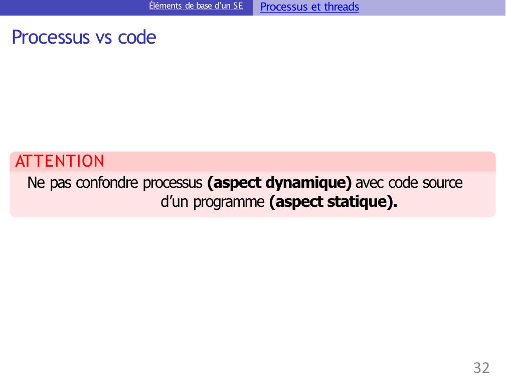 Page 32 : Éléments de base d’un SEProcessus et threadsProcessus vs codeATTENTIONNe pas confondre processus aspect dynamique avec code sourced’un programme aspect statique.32