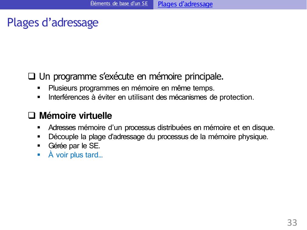 Page 33 : Éléments de base d’un SEPlages d’adressagePlages d’adressageUn programme s’exécute en mémoire principale.Plusieurs programmes en mémoire en même temps.Interférences à éviter en utilisant des mécanismes de protection.Mémoire virtuelleAdresses mémoire d’un processus distribuées en mémoire et en disque.Découple la plage d’adressage du processus de la mémoire physique.Gérée par le SE.À voir plus tard…33
