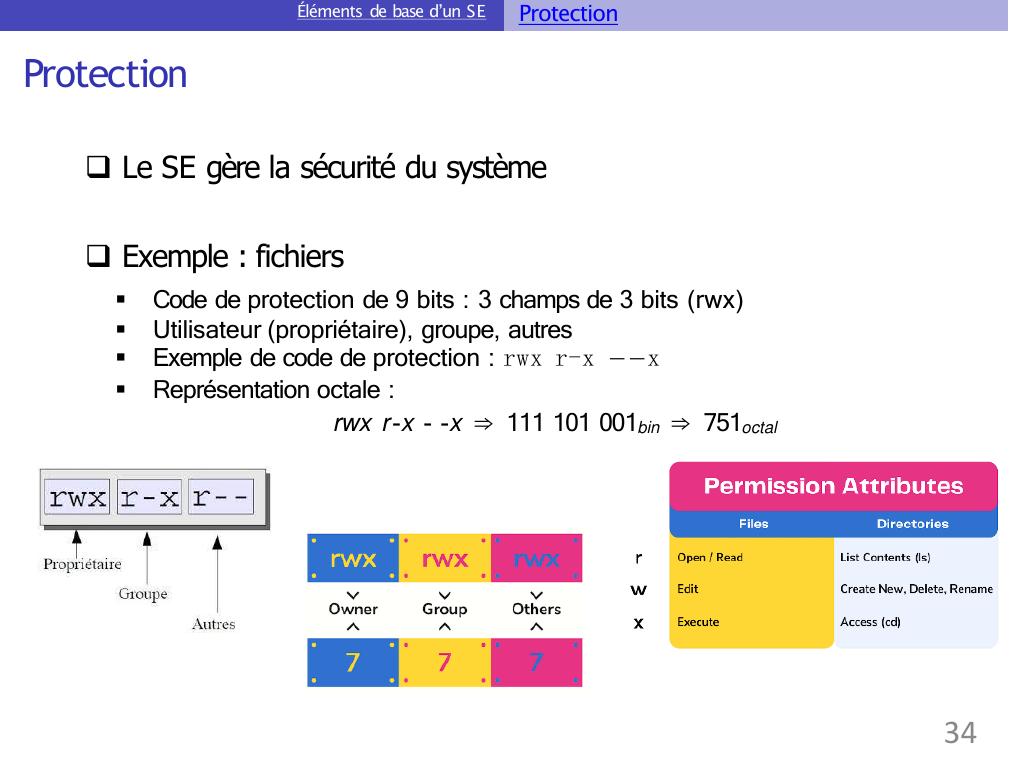 Page 34 : Éléments de base d’un SEProtectionProtectionLe SE gère la sécurité du systèmeExemple : fichiersCode de protection de 9 bits : 3 champs de 3 bits rwxUtilisateur propriétaire, groupe, autresExemple de code de protection : rwx r-x xReprésentation octale :rwx r-x - -x ⇒111 101 001bin ⇒751octal34