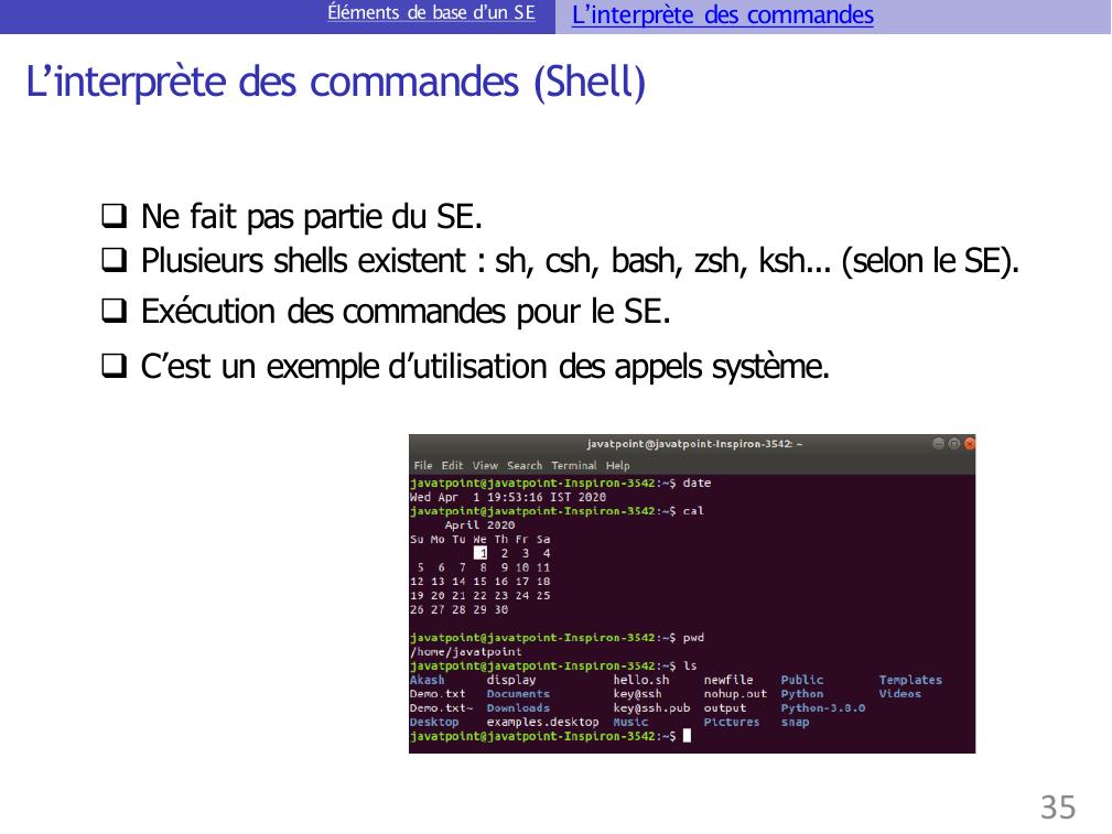 Page 35 : Éléments de base d’un SEL’interprète des commandesL’interprète des commandes ShellNe fait pas partie du SE.Plusieurs shells existent : sh, csh, bash, zsh, ksh... selon le SE.Exécution des commandes pour le SE.C’est un exemple d’utilisation des appels système.35