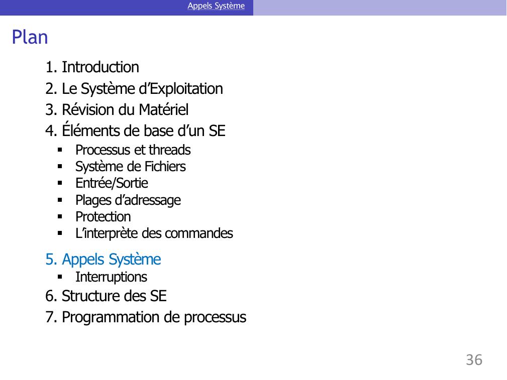 Page 36 : Plan1. Introduction2. Le Système d’Exploitation3. Révision du Matériel4. Éléments de base d’un SEProcessus et threads Système de Fichiers Entrée/Sortie Plages d’adressage ProtectionL’interprète des commandes5. Appels SystèmeInterruptions6. Structure des SE7. Programmation de processusAppels Système36