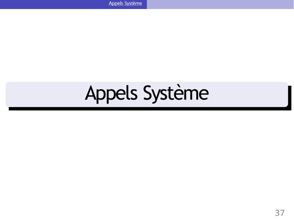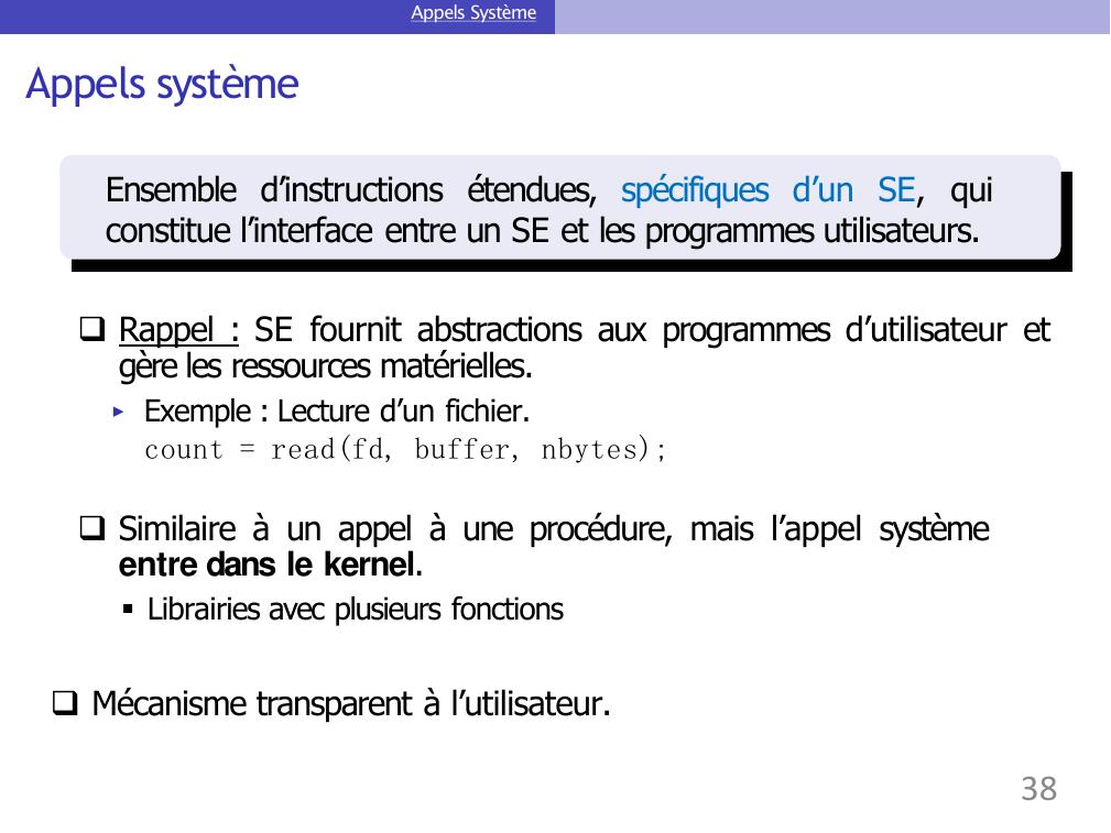 Page 38 : Appels SystèmeAppels systèmeRappel : SE fournit abstractions aux programmes d’utilisateur etgère les ressources matérielles.▶Exemple : Lecture d’un fichier.count = readfd, buffer, nbytes;Similaire à un appel à une procédure, mais l’appel systèmeentre dans le kernel.Librairies avec plusieurs fonctionsMécanisme transparent à l’utilisateur.Ensemble d’instructions étendues, spécifiques d’un SE, quiconstitue l’interface entre un SE et les programmes utilisateurs.38