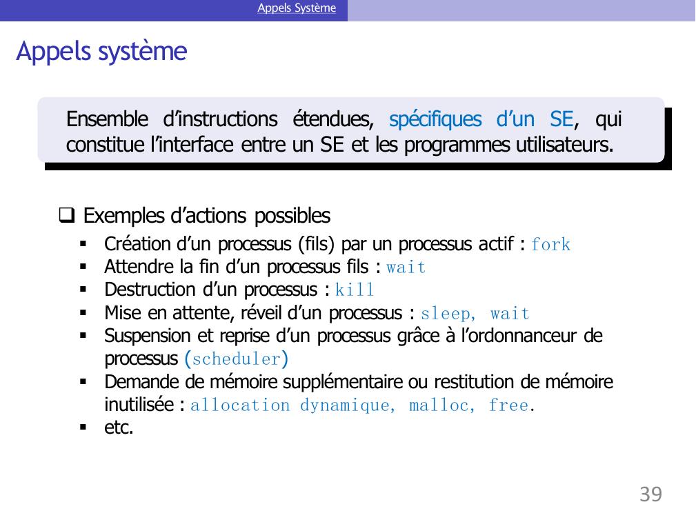 Page 39 : Appels SystèmeAppels systèmeExemples d’actions possiblesCréation d’un processus fils par un processus actif : forkAttendre la fin d’un processus fils : waitDestruction d’un processus : killMise en attente, réveil d’un processus : sleep, waitSuspension et reprise d’un processus grâce à l’ordonnanceur de processus schedulerDemande de mémoire supplémentaire ou restitution de mémoireinutilisée : allocation dynamique, malloc, free.etc.Ensemble d’instructions étendues, spécifiques d’un SE, quiconstitue l’interface entre un SE et les programmes utilisateurs.39