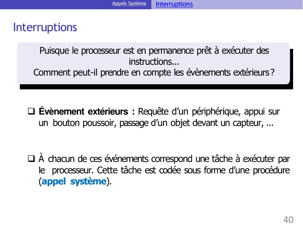 Page 40 : Appels SystèmeInterruptionsÉvènement extérieurs : Requête d’un périphérique, appui surun bouton poussoir, passage d’un objet devant un capteur, ...À chacun de ces événements correspond une tâche à exécuter parle processeur. Cette tâche est codée sous forme d’une procédureappel système.Puisque le processeur est en permanence prêt à exécuter desinstructions...Comment peut-il prendre en compte les évènements extérieurs?Interruptions40