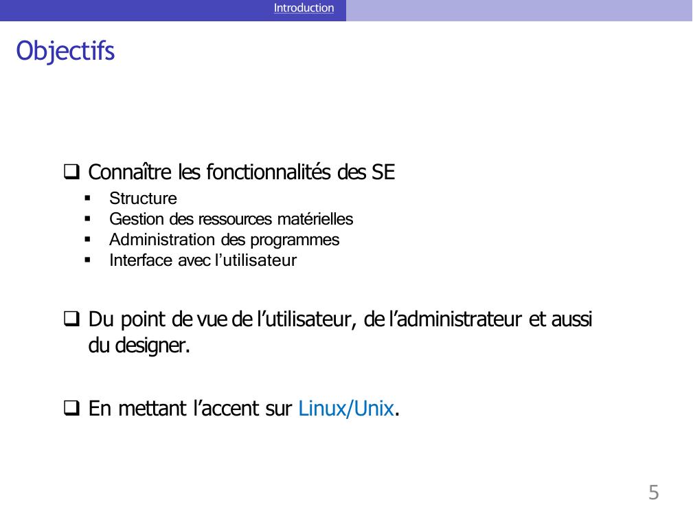 Page 5 : IntroductionObjectifsConnaître les fonctionnalités des SEStructureGestion des ressources matériellesAdministration des programmesInterface avec l’utilisateurDu point de vue de l’utilisateur, de l’administrateur et aussi du designer.En mettant l’accent sur Linux/Unix.5