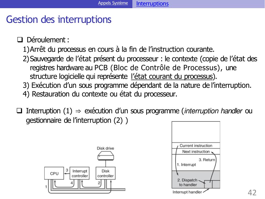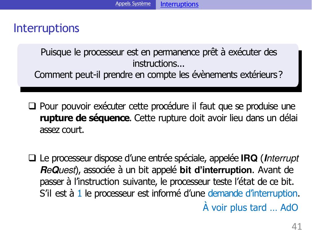 Page 41 : Appels SystèmeInterruptionsPour pouvoir exécuter cette procédure il faut que se produise une rupture de séquence. Cette rupture doit avoir lieu dans un délaiassez court.Le processeur dispose d’une entrée spéciale, appelée IRQ InterruptReQuest, associée à un bit appelé bit d’interruption. Avant de passer à l’instruction suivante, le processeur teste l’état de ce bit.S’il est à 1 le processeur est informé d’une demande d’interruption.À voir plus tard … AdOPuisque le processeur est en permanence prêt à exécuter desinstructions...Comment peut-il prendre en compte les évènements extérieurs?Interruptions41