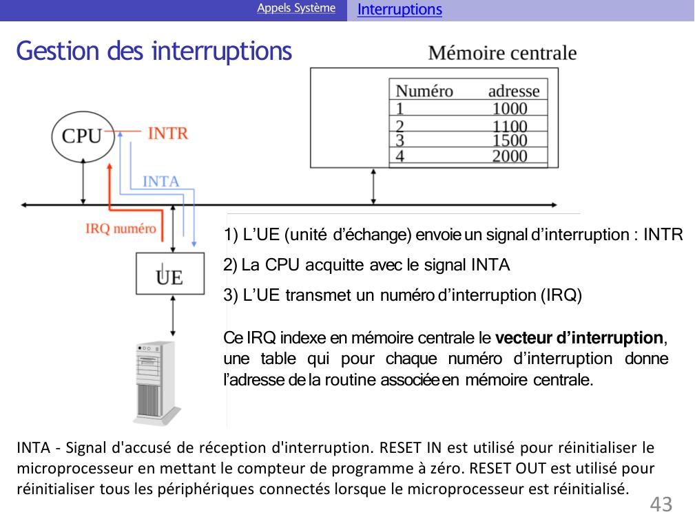 Page 43 : Appels SystèmeInterruptionsGestion des interruptions1 L’UE unité d’échange envoieun signal d’interruption : INTR 2 La CPU acquitte avec le signal INTA3 L’UE transmet un numéro d’interruption IRQCe IRQ indexe en mémoire centrale le vecteur d’interruption,une table qui pour chaque numéro d’interruption donnel’adresse dela routine associéeen mémoire centrale.43INTA - Signal d'accusé de réception d'interruption. RESET IN est utilisé pour réinitialiser lemicroprocesseur en mettant le compteur de programme à zéro. RESET OUT est utilisé pourréinitialiser tous les périphériques connectés lorsque le microprocesseur est réinitialisé.
