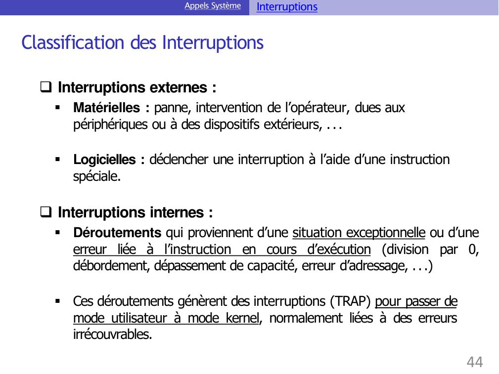 Page 44 : Appels SystèmeInterruptionsInterruptions externes :Matérielles : panne, intervention de l’opérateur, dues auxpériphériques ou à des dispositifs extérieurs, ...Logicielles : déclencher une interruption à l’aide d’une instructionspéciale.Interruptions internes :Déroutements qui proviennent d’une situation exceptionnelle ou d’uneerreur liée à l’instruction en cours d’exécution division par 0,débordement, dépassement de capacité, erreur d’adressage, ...Ces déroutements génèrent des interruptions TRAP pour passer demode utilisateur à mode kernel, normalement liées à des erreursirrécouvrables.Classification des Interruptions44
