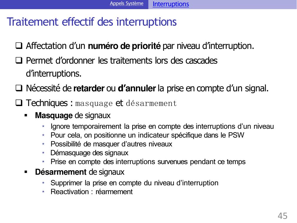 Page 45 : Appels SystèmeInterruptionsTraitement effectif des interruptionsAffectation d’un numéro de priorité par niveau d’interruption.Permet d’ordonner les traitements lors des cascadesd’interruptions.Nécessité de retarder ou d’annuler la prise en compte d’un signal.Techniques : masquage et désarmementMasquage de signauxIgnore temporairement la prise en compte des interruptions d’un niveauPour cela, on positionne un indicateur spécifique dans le PSWPossibilité de masquer d’autres niveauxDémasquage des signauxPrise en compte des interruptions survenues pendant ce tempsDésarmement de signauxSupprimer la prise en compte du niveau d’interruptionReactivation : réarmement45
