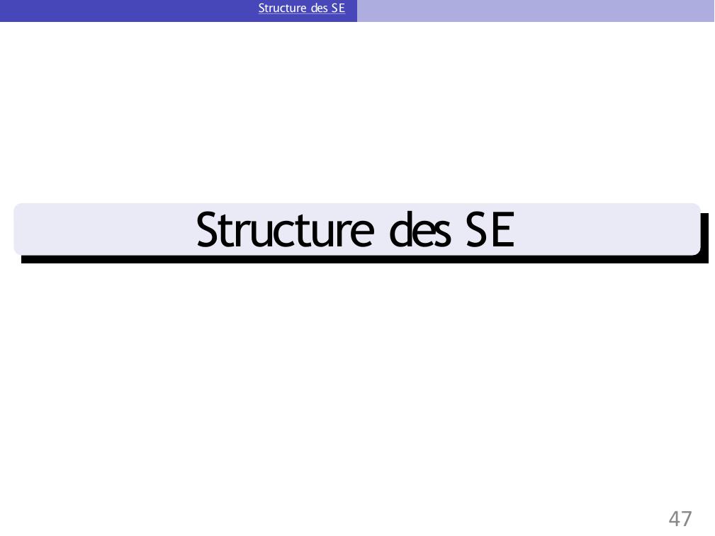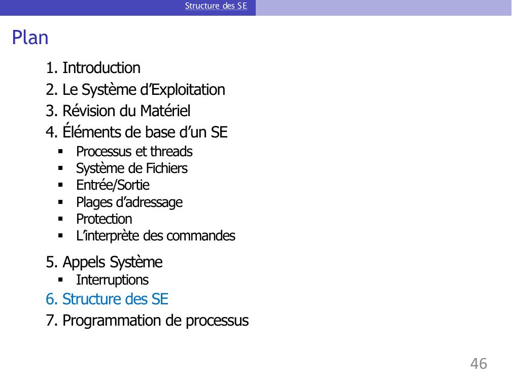Page 46 : Plan1. Introduction2. Le Système d’Exploitation3. Révision du Matériel4. Éléments de base d’un SEProcessus et threads Système de Fichiers Entrée/Sortie Plages d’adressage ProtectionL’interprète des commandes5. Appels SystèmeInterruptions6. Structure des SE7. Programmation de processusStructure des SE46