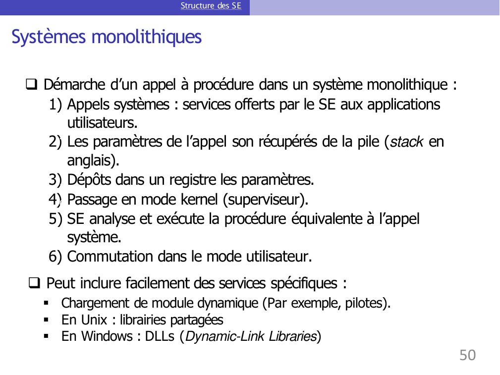 Page 50 : Structure des SESystèmes monolithiquesDémarche d’un appel à procédure dans un système monolithique :1 Appels systèmes : services offerts par le SE aux applicationsutilisateurs. 2 Les paramètres de l’appel son récupérés de la pile stack enanglais.3 Dépôts dans un registre les paramètres.4 Passage en mode kernel superviseur.5 SE analyse et exécute la procédure équivalente à l’appelsystème. 6 Commutation dans le mode utilisateur.123456Peut inclure facilement des services spécifiques :Chargement de module dynamique Par exemple, pilotes.En Unix : librairies partagéesEn Windows : DLLs Dynamic-Link Libraries50