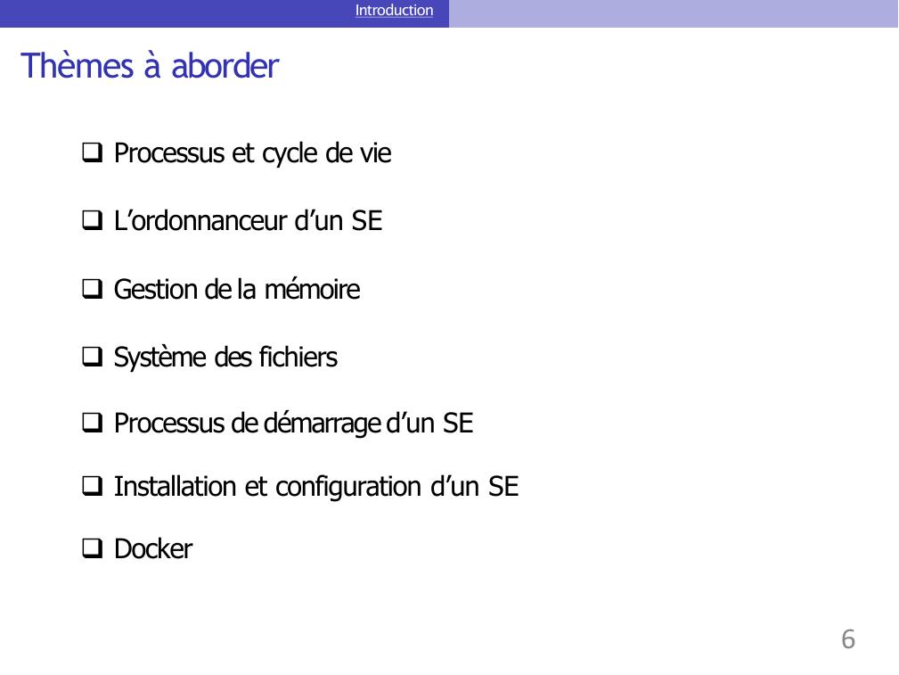 Page 6 : IntroductionThèmes à aborderProcessus et cycle de vie L’ordonnanceur d’un SE Gestion de la mémoireSystème des fichiersProcessus de démarrage d’un SEInstallation et configuration d’un SEDocker 6
