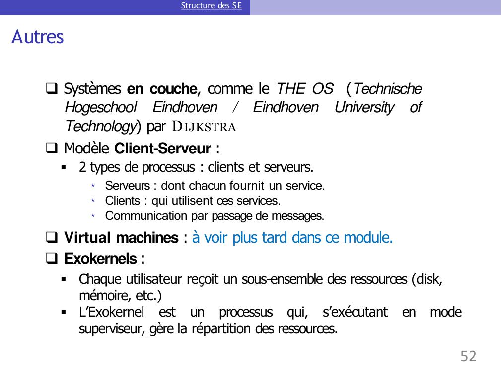 Page 52 : Structure des SEAutresSystèmes en couche, comme le THE OSTechnischeHogeschoolEindhoven/EindhovenUniversityofTechnology par DIJKSTRAModèle Client-Serveur :2 types de processus : clients et serveurs.Serveurs : dont chacun fournit un service.Clients : qui utilisent ces services.Communication par passage de messages.Virtual machines : à voir plus tard dans ce module.Exokernels :Chaque utilisateur reçoit un sous-ensemble des ressources disk,mémoire, etc.L’Exokernelestunprocessusqui,s’exécutantenmodesuperviseur, gère la répartition des ressources.52