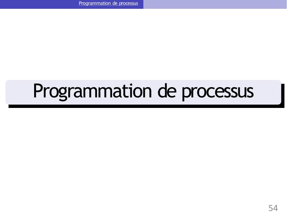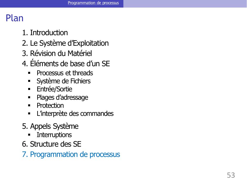 Page 53 : Plan1. Introduction2. Le Système d’Exploitation3. Révision du Matériel4. Éléments de base d’un SEProcessus et threads Système de Fichiers Entrée/Sortie Plages d’adressage ProtectionL’interprète des commandes5. Appels SystèmeInterruptions6. Structure des SE7. Programmation de processusProgrammation de processus53
