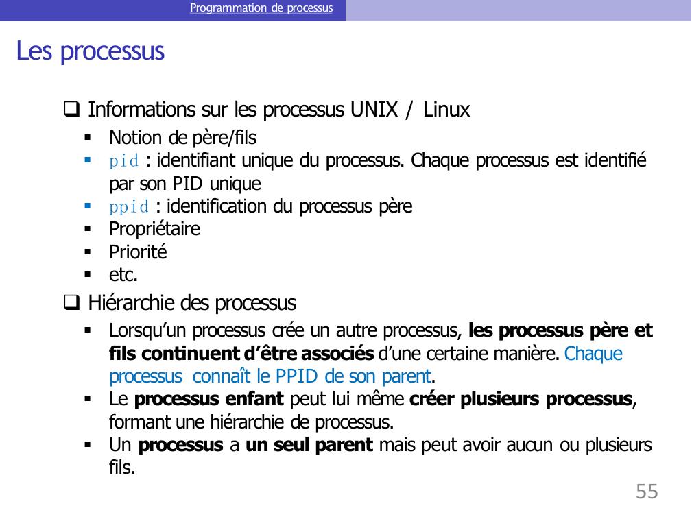 Page 55 : Programmation de processusLes processusInformations sur les processus UNIX / LinuxNotion de père/filspid : identifiant unique du processus. Chaque processus est identifié par son PID uniqueppid : identification du processus pèrePropriétairePrioritéetc.Hiérarchie des processusLorsqu’un processus crée un autre processus, les processus père etfils continuent d’être associés d’une certaine manière. Chaque processus connaît le PPID de son parent.Le processus enfant peut lui même créer plusieurs processus,formant une hiérarchie de processus.Un processus a un seul parent mais peut avoir aucun ou plusieursfils.55